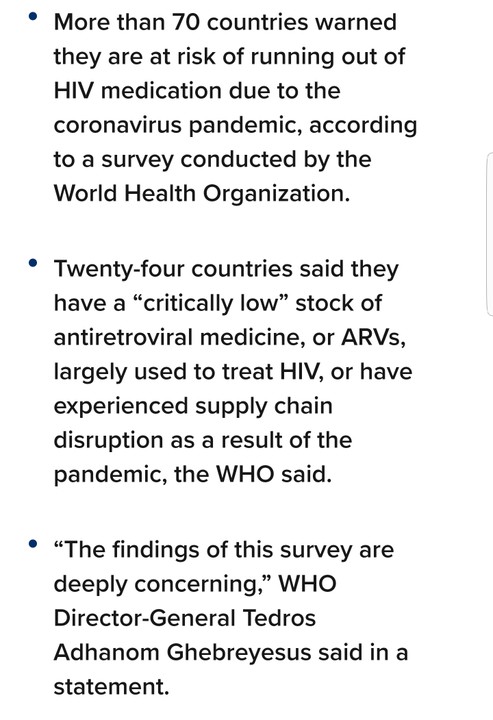 “The findings of this survey are deeply concerning,” WHO Director-General Tedros Adhanom Ghebreyesus said in a statement. “Countries and their development partners must do all they can to ensure that people who need HIV treatment continue to access it. We cannot let the COVID-19 pandemic undo the hard-won gains in the global response to this disease.”