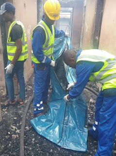 However, although the whole of the top floor of the building was completely burnt down, the down floor was salvaged by the combined efforts of LASEMA, Red cross, the Lagos State Fire Service and Itire division of the Police Force. The dead body has since been recovered and handed over to the Police.