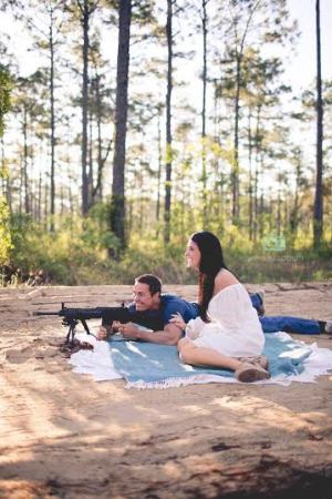 This couple used a r!fle to find out the gender of their unborn baby. A box with the inscription – ‘It’s a’ was filled with blue chalk and placed at a distance. The father of the unborn child laid on the floor from afar, with his wife by his side and sh0t a bull€t at the box. When the bull€t hit the target, blue chalk exploded revealing that they were expecting a baby boy.