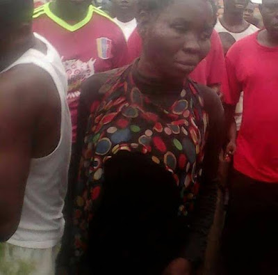 According to the eyewitness who shared these photos, the woman (pictured) was caught today while trying to kidnap a child, at Kembiri Road, Okokomaiko, Lagos. A mob gathered to beat her, but she was rescued and taken away by the police.
