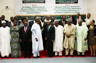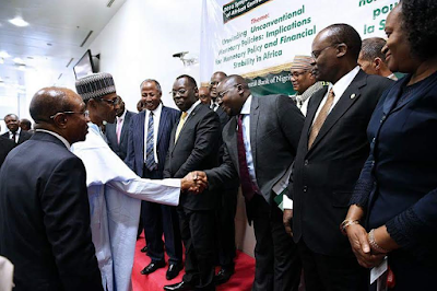President Buhari this morning declared open the Annual Meeting of the Association of African Central Banks (AACB) holding in Abuja. He was received by Nigeria’s Central Ban governor, Godwin Emefiele, Chairman Senate committee on banking, insurance and other financial institutions, Senator Rafiu Ibrahim, Minister of Finance Kemi Adeosun and Central Bank Governors from other African countries.