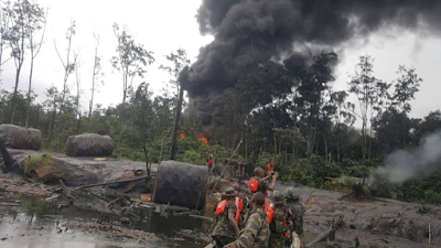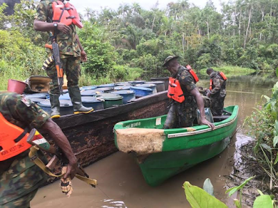 Following intelligence reports, 2 illegal crude oil refineries were identified and destroyed by the exercising troops traversing Ayakoromo and Esaba water ways in Burutu Local Government Area of Delta State.