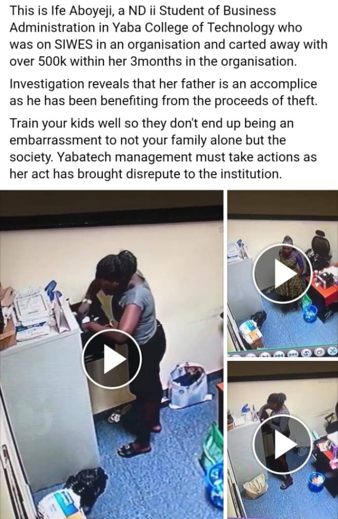 A Beautiful YABATECH IT Student Caught On CCTV Stealing N500,000 In The Office, Hides It In Her Private Part!! A pretty Student Of Business Administration in YABATECH who was doing her SIWES Program (IT) in a big company was caught red-handed both by her boss and CCTV camera stealing N500k Cash from safe and hiding it inside her private part. She had first stolen some money and no one noticed, so she went again to steal in the morning yesterday and no one also noticed. She went back again for the third time in the afternoon to steal again that was when her madam worked in on her and after they now Reviewed the CCTV camera footages. All Her previous atrocities came to light. Ayodele Gbenga Oladimeji sharing the videos on Facebook wrote: “This is Ife Aboyeji, a ND ii Student of Business Administration in Yaba College of Technology who was on SIWES in an organisation and carted away with over 500k within her 3months in the organisation. Investigation reveals that her father is an accomplice as he has been benefiting from the proceeds of theft. Train your kids well so they don’t end up being an embarrassment to not your family alone but the society. Yabatech management must take actions as her act has brought disrepute to the institution.”