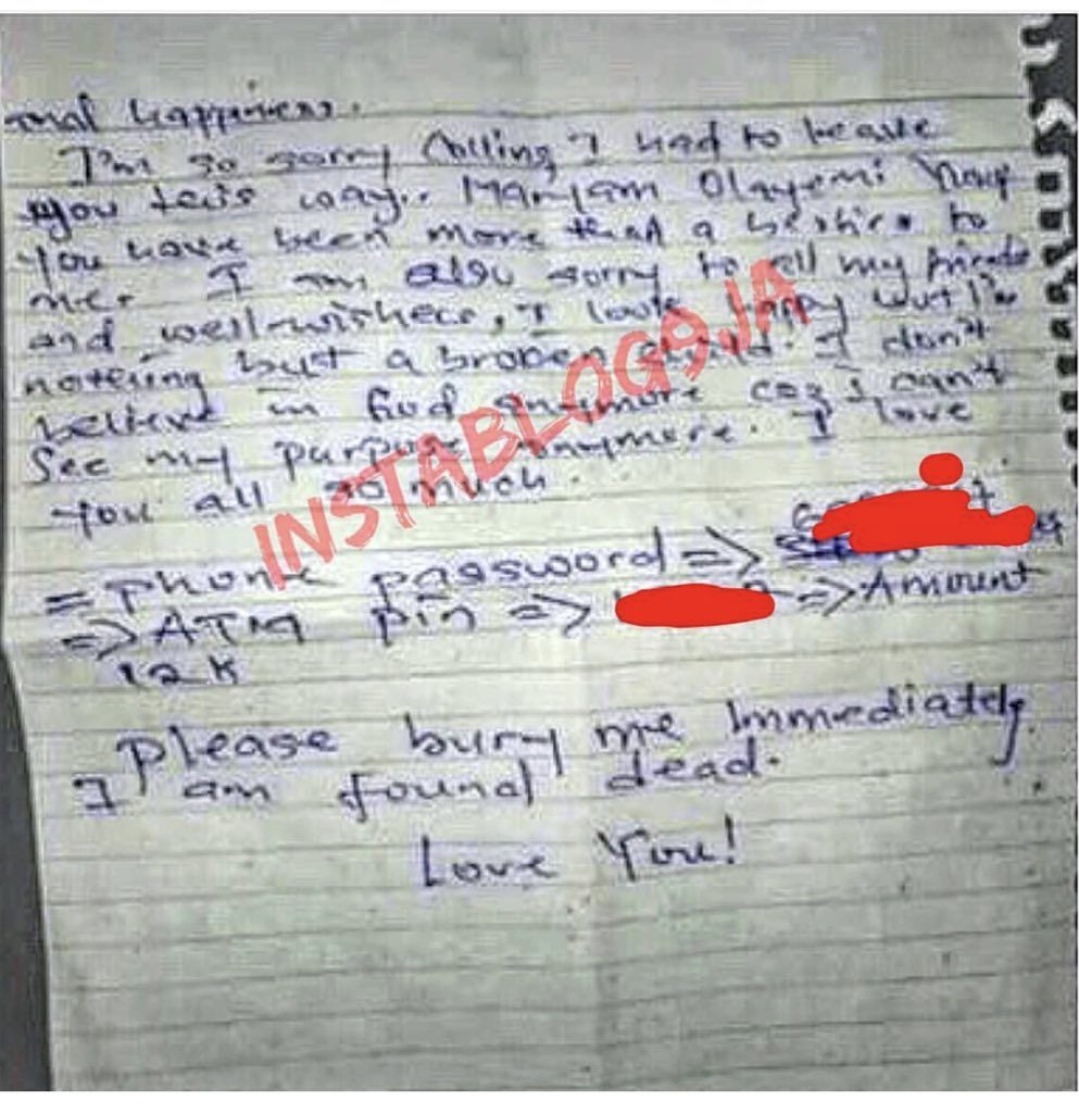 She reportedly took poison “Sniper” earlier today in her apartment at Samaru which immediately took her life. She left a letter attached to her body bidding farewell to her friends and loved ones.
