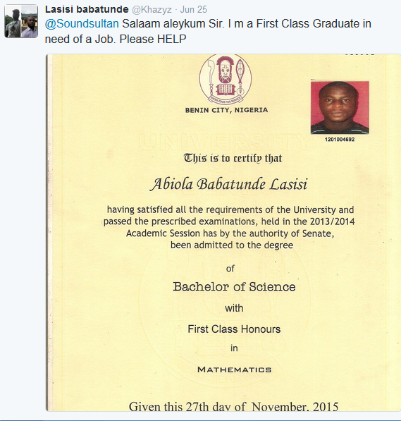 A First Class Graduate From UNIBEN Is Begging For Job On Twitter (See Photos)