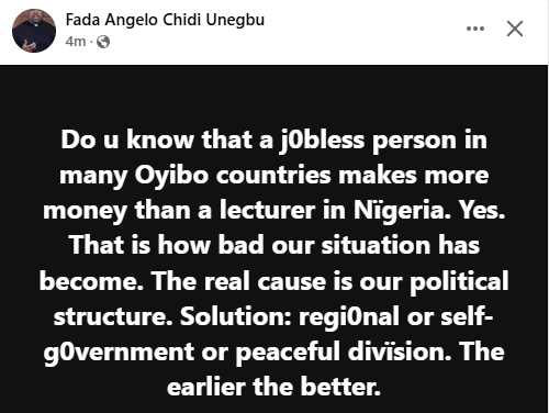 “Do u know that a j0bless person in many Oyibo countries makes more money than a lecturer in Nïgeria. Yes. That is how bad our situation has become. The real cause is our political structure. Solution: regi0nal or self-g0vernment or peaceful divïsion. The earlier the better,” he wrote.