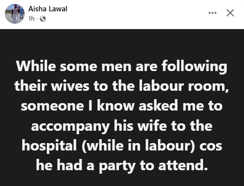 “While some men are following their wives to the labour room, someone I know asked me to accompany his wife to the hospital (while in labour) cos he had a party to attend,” she wrote in a Facebook post on Thursday.