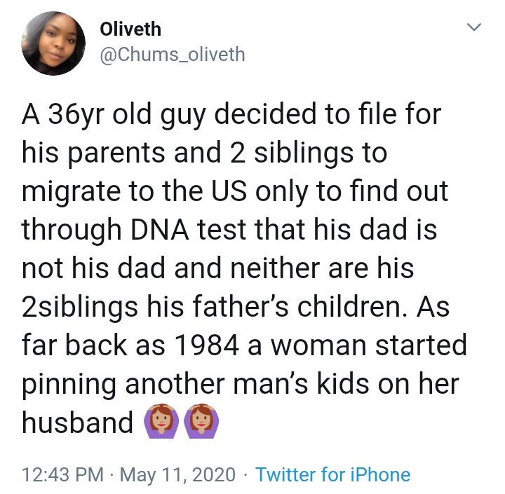 A 36yr old guy decided to file for his parents and 2 siblings to migrate to the US only to find out through DNA test that his dad is not his dad and neither are his 2siblings his father’s children.