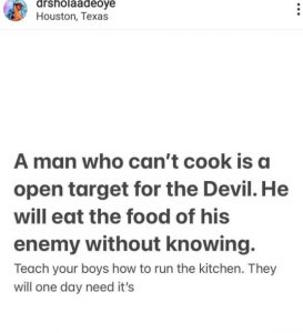 “A man who can’t cook is an open target for the devil, he will eat the food of his enemy without knowing. Teach your boys how to run the kitchen, they will one day need it.” he wrote.