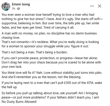 An Akwa Ibom pastor’s wife, Emem Isong, has said that a man with no money and plan has no business looking for love.