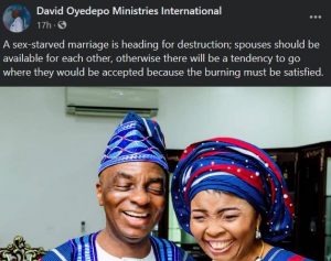 In a post shared on his Ministries social media handles this evening, the clergyman averred that a sex-starved marriage is heading for destruction.