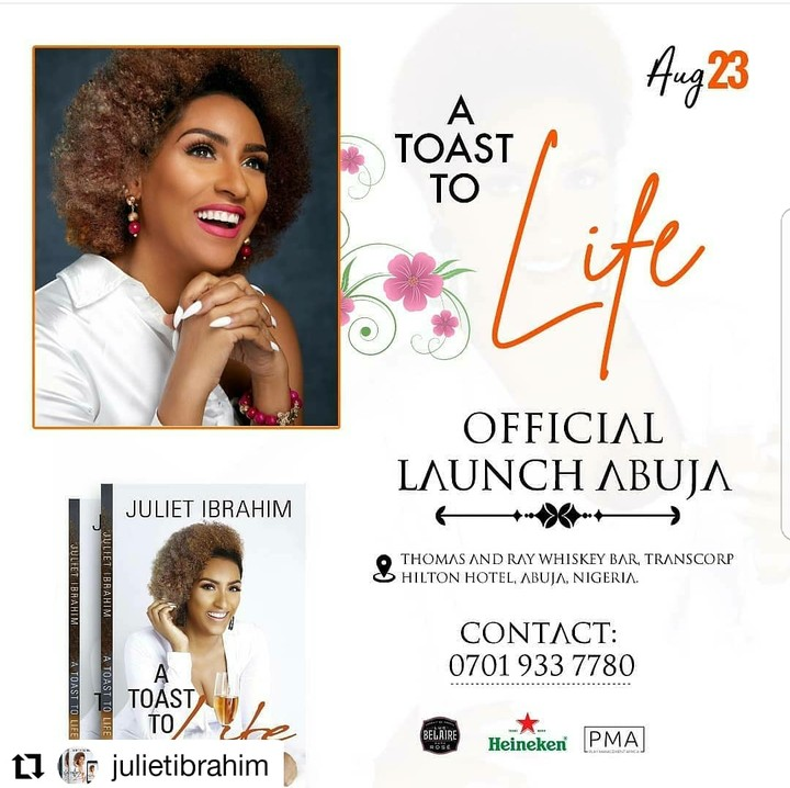 Africa’s reknowned Actress, Singer and humanitarian, Juliet Ibrahim has invited Abuja residents to the unveiling of her new book, titled, “A Toast To Life”. The “Official Launch Abuja” ceremony is scheduled today, 23rd of August at Transcorp Hilton Thomas and Ray Whiskey Bar, Abuja.