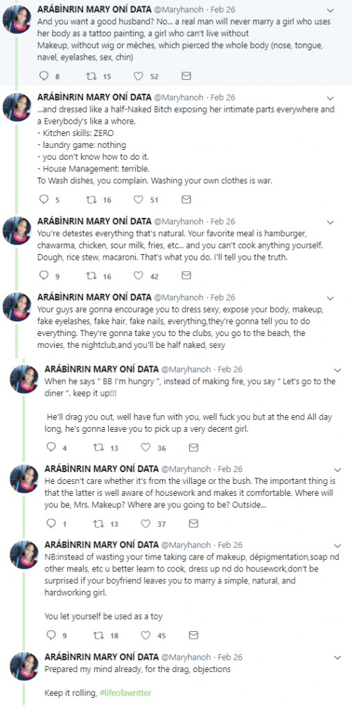 A female Twitter user’s posts about women and marriage have sparked a debate online. Continue to read them and tell us what you think.