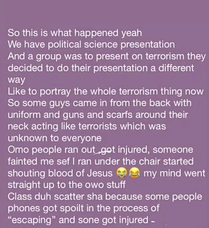 Students and a lecturer of the Adekunle Ajasin University Akungba in Ondo state recently ran for their lives after some of the students in their class came in dressed as terrorists for a presentation they were having on terrorism.