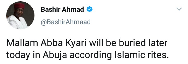 Mallam Abba Kyari will be buried later today in Abuja according Islamic rites.