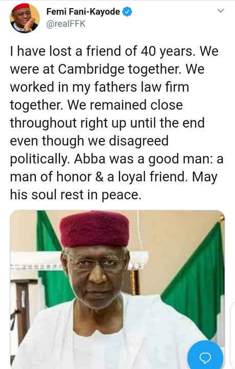 Nigerian politician and Frontline critic of the President Buhari’s government, Olufemi Fani Kayode popularly called FFK, has paid glowing tributes to the dead C.O.S. Abba Kyari.
