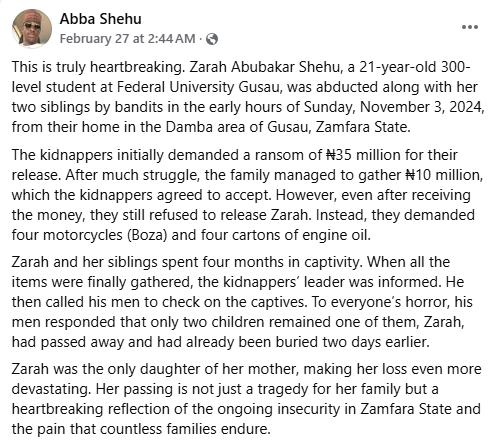 Zarah, a 300-level student, was taken from her home in the Damba area of Gusau in the early hours of Sunday, November 3, 2024, by armed bandits.