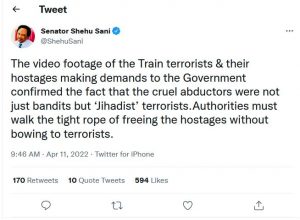 The tweet reads, “The video footage of the Train terrorists & their hostages making demands to the Government confirmed the fact that the cruel abductors were not just bandits but ‘Jihadist’ terrorists.