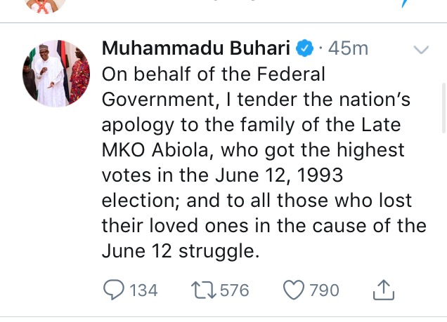 On behalf of the Federal Government, I tender the nation’s apology to the family of the Late MKO Abiola, who got the highest votes in the June 12, 1993 election; and to all those who lost their loved ones in the cause of the June 12 struggle.