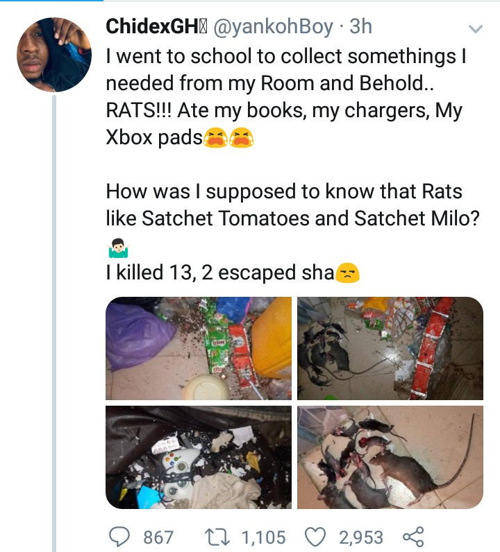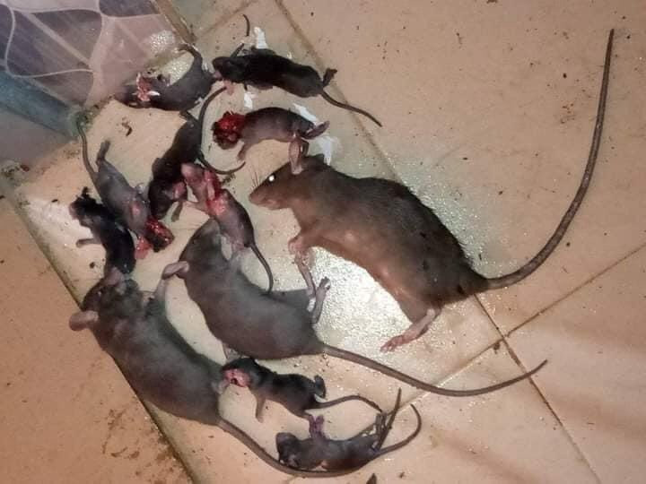 He shared photos showing the extent of damage done to his properties. He revealed that he killed 13 out of 15 rats found in his room and he shared photos of the dead rats.