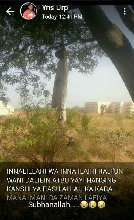A corpse of a student from agric education ATBU BAUCHI was found hanging up on a tree in an early hours of today.It is unclear what made him commit suicide.