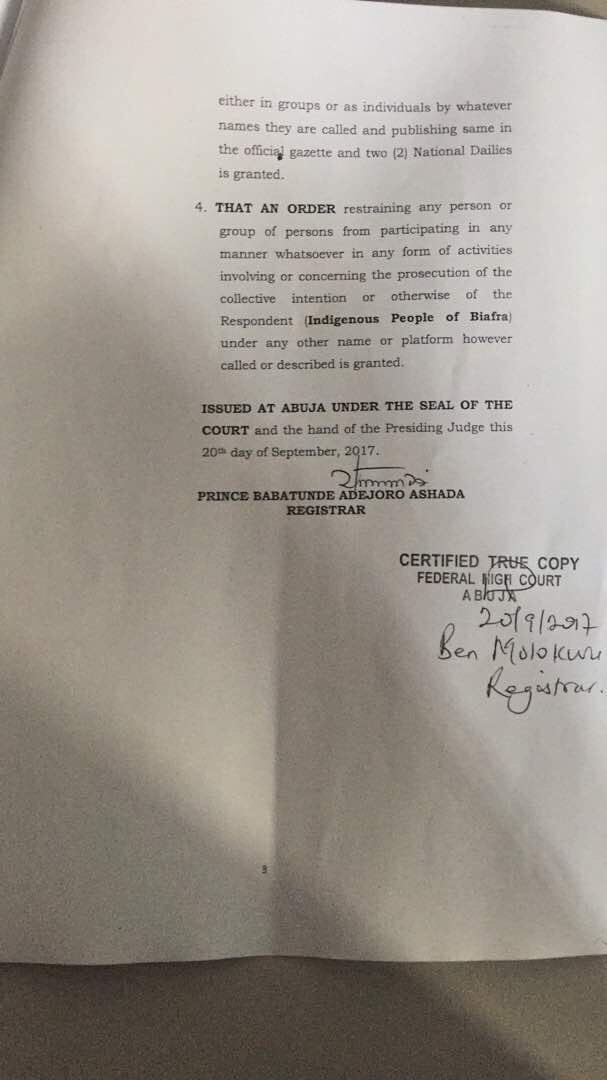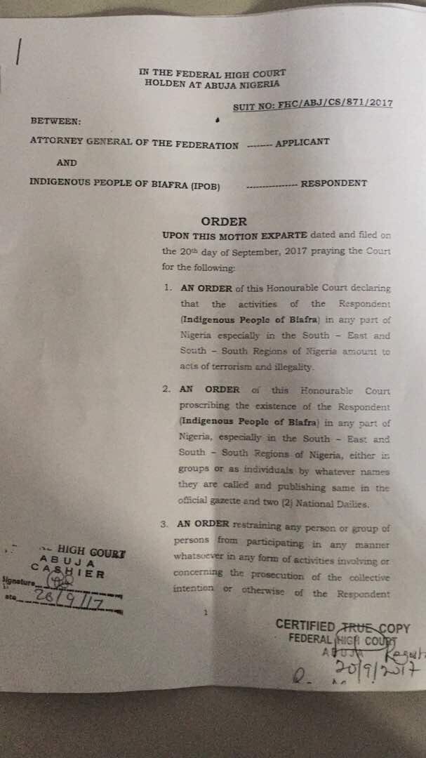 According to Papers gotten by Sahara Reporters, The Indigenous People Of Biafra has now been proscribed and declared a terrorist group according an Abuja court on the prayers of the Attorney general of the federation