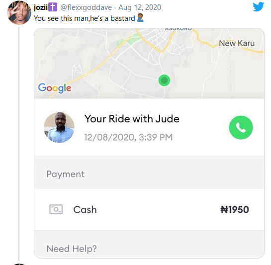 The woman shared a screenshot of the driver’s profile on the ride hailing app and called him a bastard.