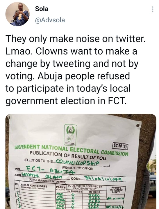 They only make noise on twitter. Lmao. Clowns want to make a change by tweeting and not by voting. Abuja people refused to participate in today’s local government election in FCT.
