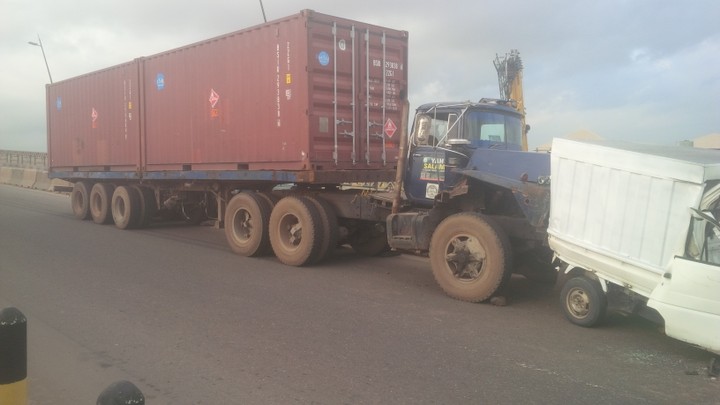 It all happened when a Mark failed brake and the driver lost control of the heavy duty truck causing it to collide with a mini van which sped into another truck moving at a slow pace due to traffic jam.