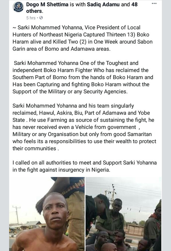 Sarki Mohammed Yohanna, Vice President of Local Hunters of Northeast Nigeria allegedly captured alive 13 Boko Haram terrorists alive and killed two in one week around Sabon Garin area of Borno and Adamawa areas.    According to Borno State government official:   “Sarki Mohammed Yohanna is one of the toughest and independent Boko Haram Fighter who has reclaimed the Southern Part of Borno from the hands of Boko Haram and Has been Capturing and fighting Boko Haram without the Support of the Military or any Security Agencies.  Sarki Mohammed Yohanna and his team singularly reclaimed, Hawul, Askira, Biu, Part of Adamawa and Yobe State . He use Farming as source of sustaining the fight, he has never received even a Vehicle from government  , Military or any Organisation but only from good Samaritan who feels its a responsibilities to use their wealth to protect their communities .  I called on all authorities to meet and Support Sarki Yohanna in the fight against insurgency in Nigeria.”