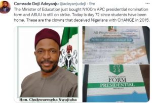 ”The Minister of Education just bought N100m APC presidential nomination form and ASUU is still on strike. Today is day 72 since students have been home. These are the clowns that deceived Nigerians with CHANGE in 2015.”