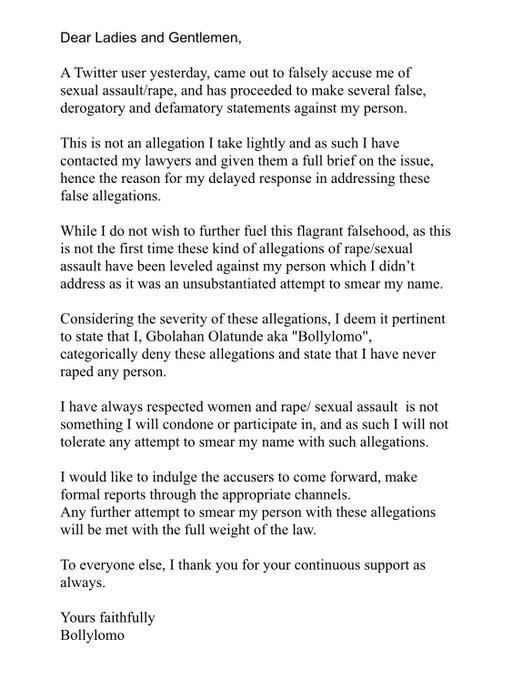 Reacting to the rape allegation, Bollylomo stated that this is not the first time such allegation has been made against him. He further disclosed that he has briefed his lawyers on the issue, which is why he took so much time to reply.
