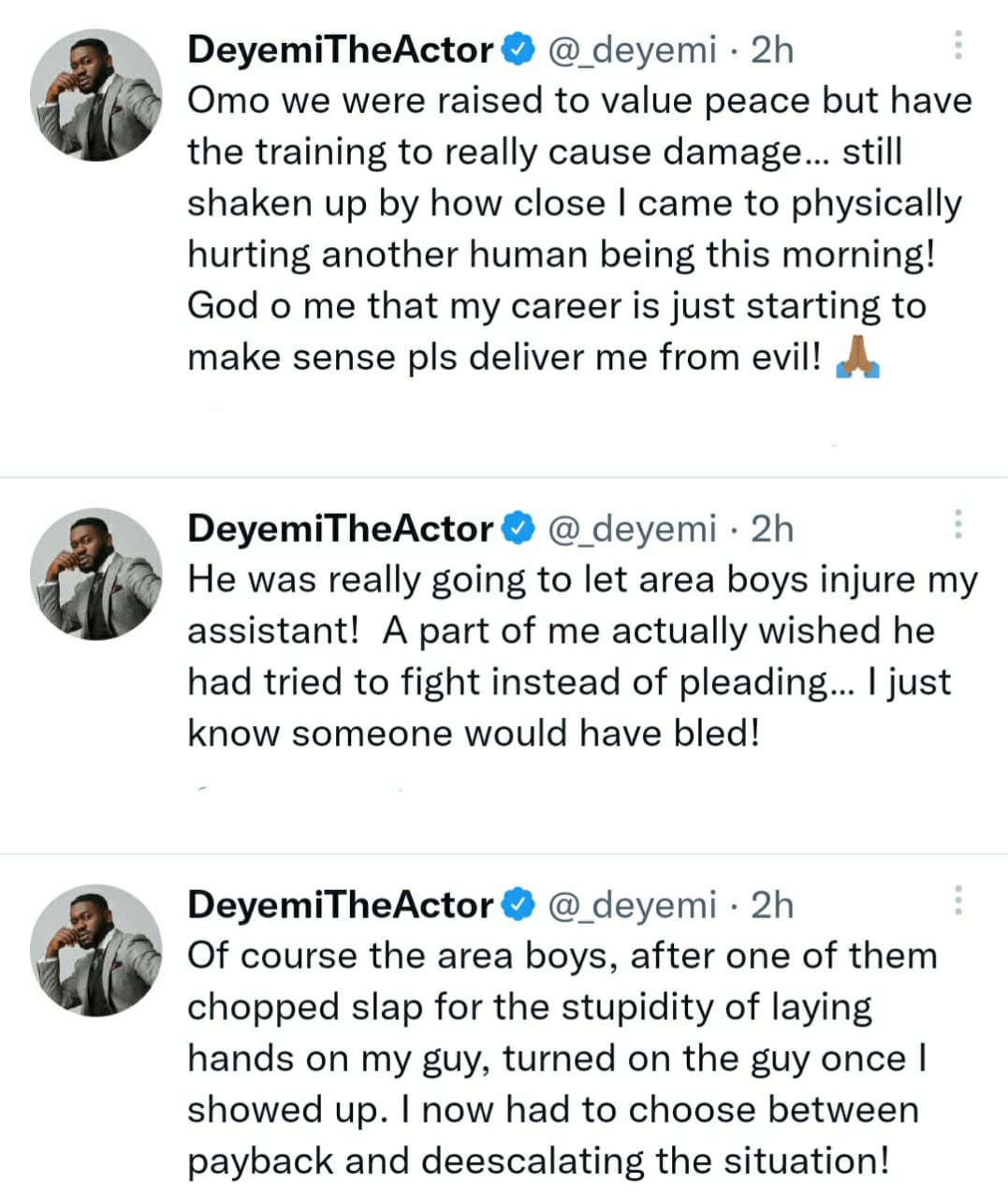 In a series of tweets, Deyemi said a motorist had scratched his car and while in talks with his assistant as to how the car can be fixed, the erring driver raised a false alarm, claiming his assistant was a thief.