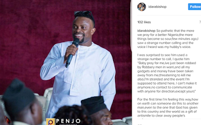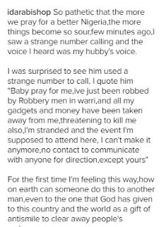 The wife of Bishop, popularly known as Okon, took to her IG account to express her sad feelings over a robbery attack on her husband. Her husband was robbed in Warri, and all of his gadgets and money were taken away from him. Read below, what his disturbed wife wrote below:-