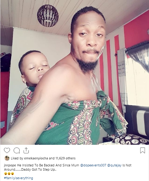 Actor Junior Pope Odonwodo shared a photo of himself backing his son and explained why.