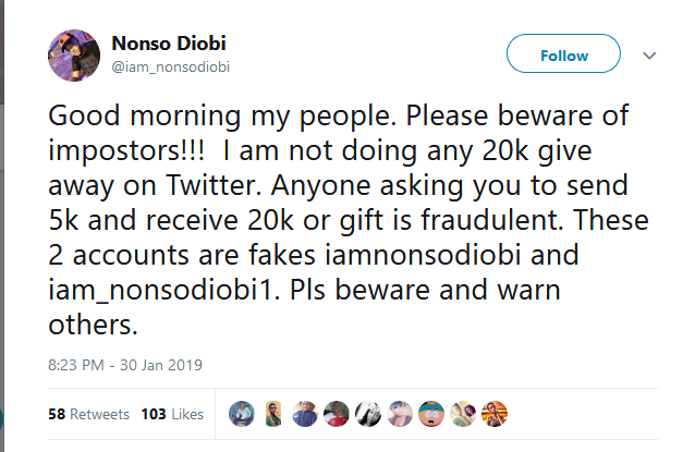 Good morning my people. Please beware of impostors!!! I am not doing any 20k give away on Twitter. Anyone asking you to send 5k and receive 20k or gift is fraudulent. These 2 accounts are fakes iamnonsodiobi and iam_nonsodiobi1. Pls beware and warn others.