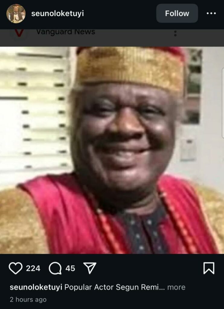 Veteran Nigerian actor Segun Remi, popularly known by his stage name Chief Kanran, has passed away at the age of 72.