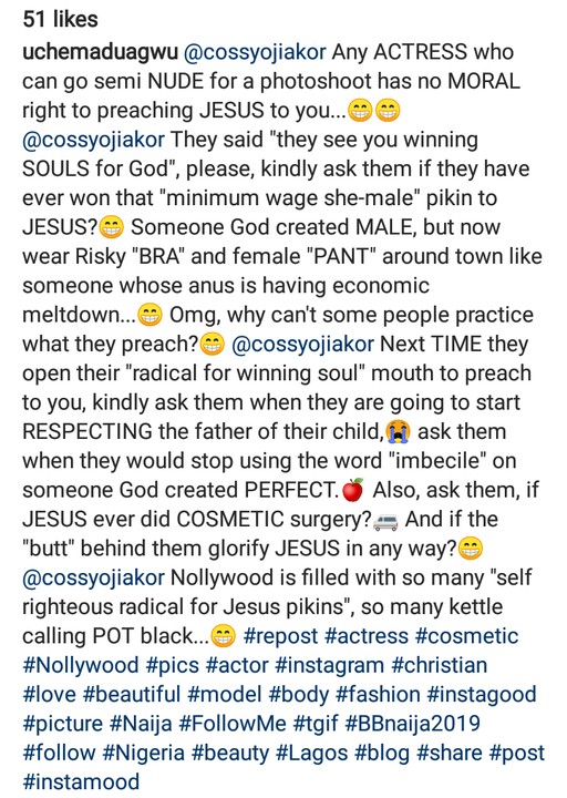 Meanwhile controversial actor Uche Maduagwu throw shade at Tonto Dikeh for preaching to Cossy Orjiakor to give her life to jesus, says she has not right because she’s also a semi nude actress.
