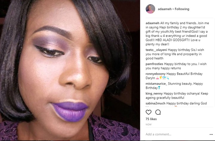 “All my family and friends. Join me in saying Hapi birthday 2 my daughter!!d gift of my youth,My best friend!God I say a big thank u 4 everything ur indeed a good God!!! HBD ALADI GODSGIFT!! Love u plenty my dear!!”