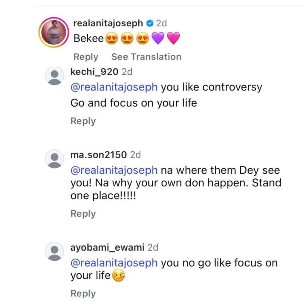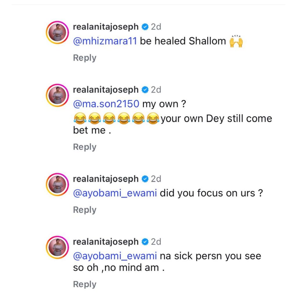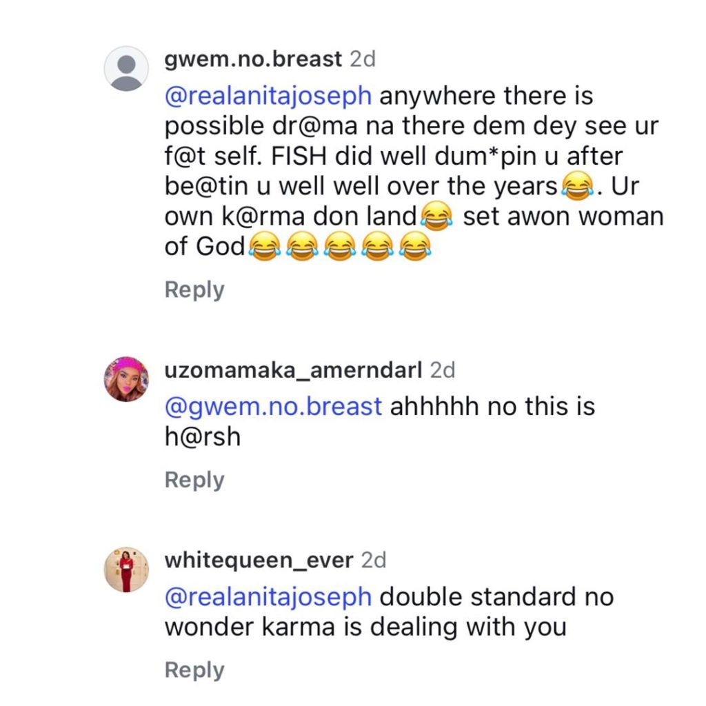 Actress Anita Joseph has clapped back at trolls who attacked her for commenting on actress, Rosy Muerer’s Instagram page.