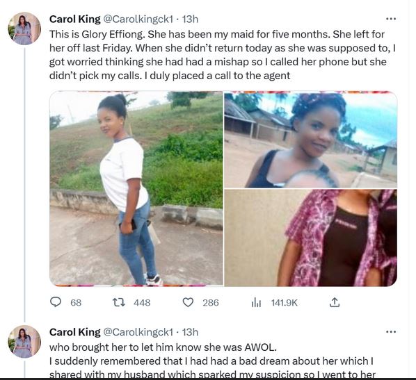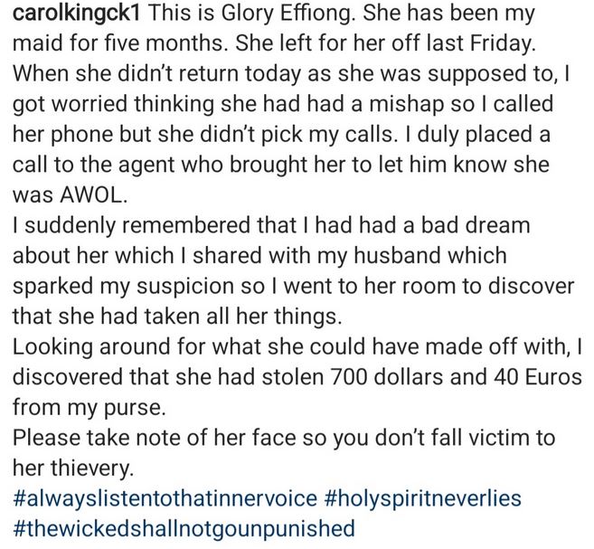 Carol King gave the name of the househelp as Glory Effiong, adding that she went AWOL (absent without official leave) after five months on the job.