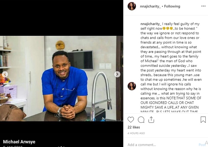 Actress Nnaji Charity has recounted how she ignored chats of gospel Minister, Michael Aworosaiye who committed suicide few days ago in Abuja. Nnaji Charity in her post disclosed that she feels guilty now after she ignored chats of the gospel minister, following reports which revealed that he committed suicide.