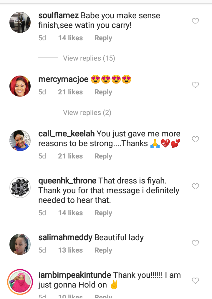 The Curvy actress advises us to hold on, she said, “She just want us hold on strong, that she know that life might be difficult for you, that challenges may have throw you up , but never give up to life”.
