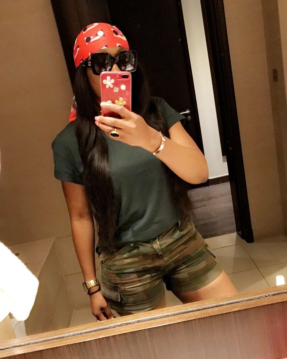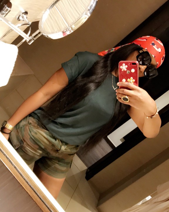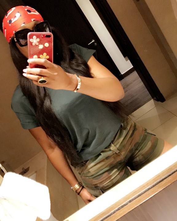 Nollywood actress, ebube nwagbo looks stylish as she took mirror selfies in her camouflage bum shorts and army green t shirt.