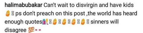 Last night, actress Halima Abubakar shared the photo above with the caption that she can’t wait to loose her virginity and start having kids. Trolls immediately bombarded her comment section, despite editing the part where she mentioned loosing her virginity.