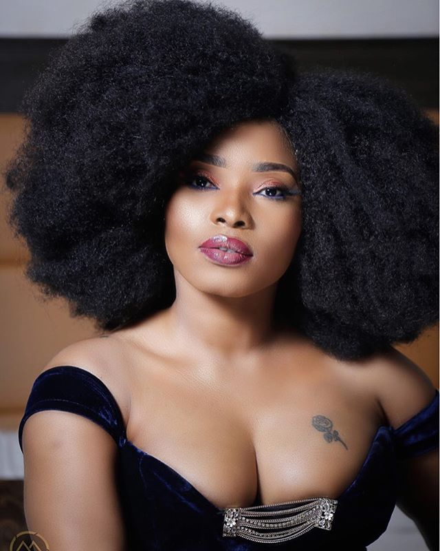 Nigerian Actress Halima Abubakar shares sexy photo as she bares cleavage in a blue dress.