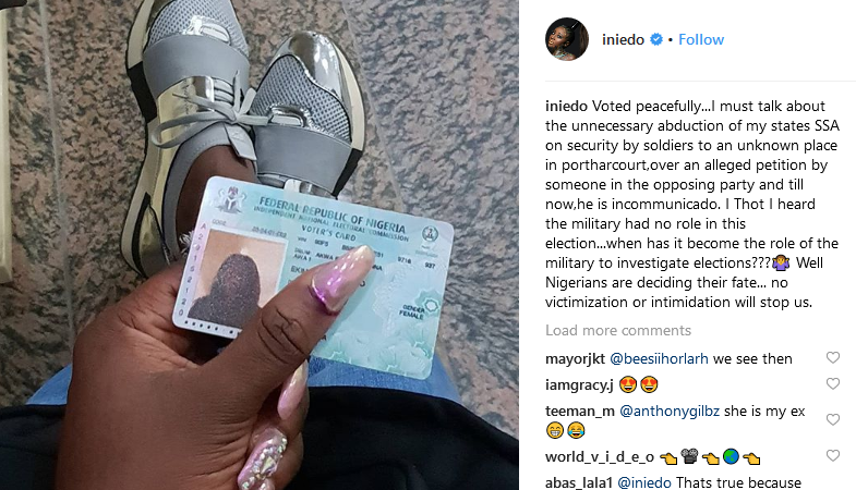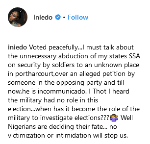 Voted peacefully…I must talk about the unnecessary abduction of my states SSA on security by soldiers to an unknown place in portharcourt,over an alleged petition by someone in the opposing party and till now,he is incommunicado. I Thot I heard the military had no role in this election…when has it become the role of the military to investigate elections???🤷♀️ Well Nigerians are deciding their fate… no victimization or intimidation will stop us.