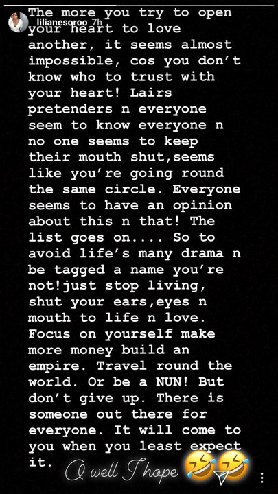 Lilian Esoro who is currently on vacation in Europe, stated that it is not easy finding love again as there are so many liars and pretenders. Her insta-story which addressed the challenges of finding love again reads;