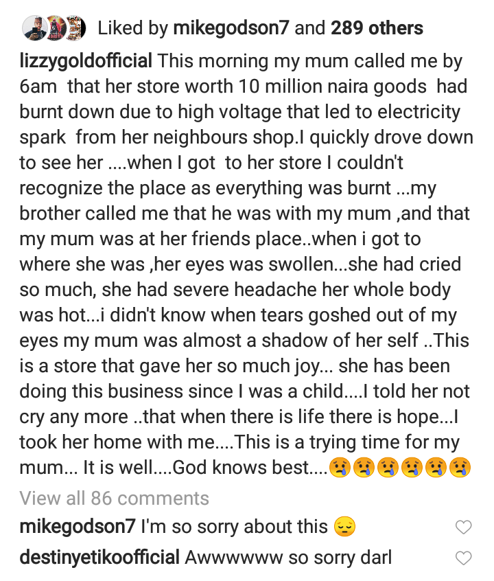 Fast rising actress Lizzy Gold narrates sadly how her mum’s shop worth of 10million naira burnt down in middle of the night due to high voltage of electricity.