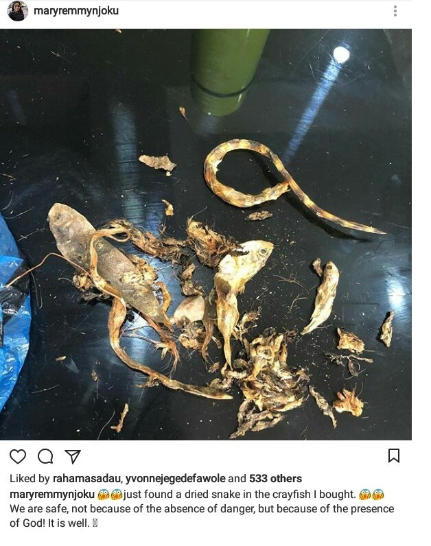 Star Actress Mary Remmy Njoku has been shredded to pieces after she found a dead and dried snake inside Crayfish she bought yesterday, The Screen beautiful immediately retraced her steps to God and Called upon his presence to take charge of her life..